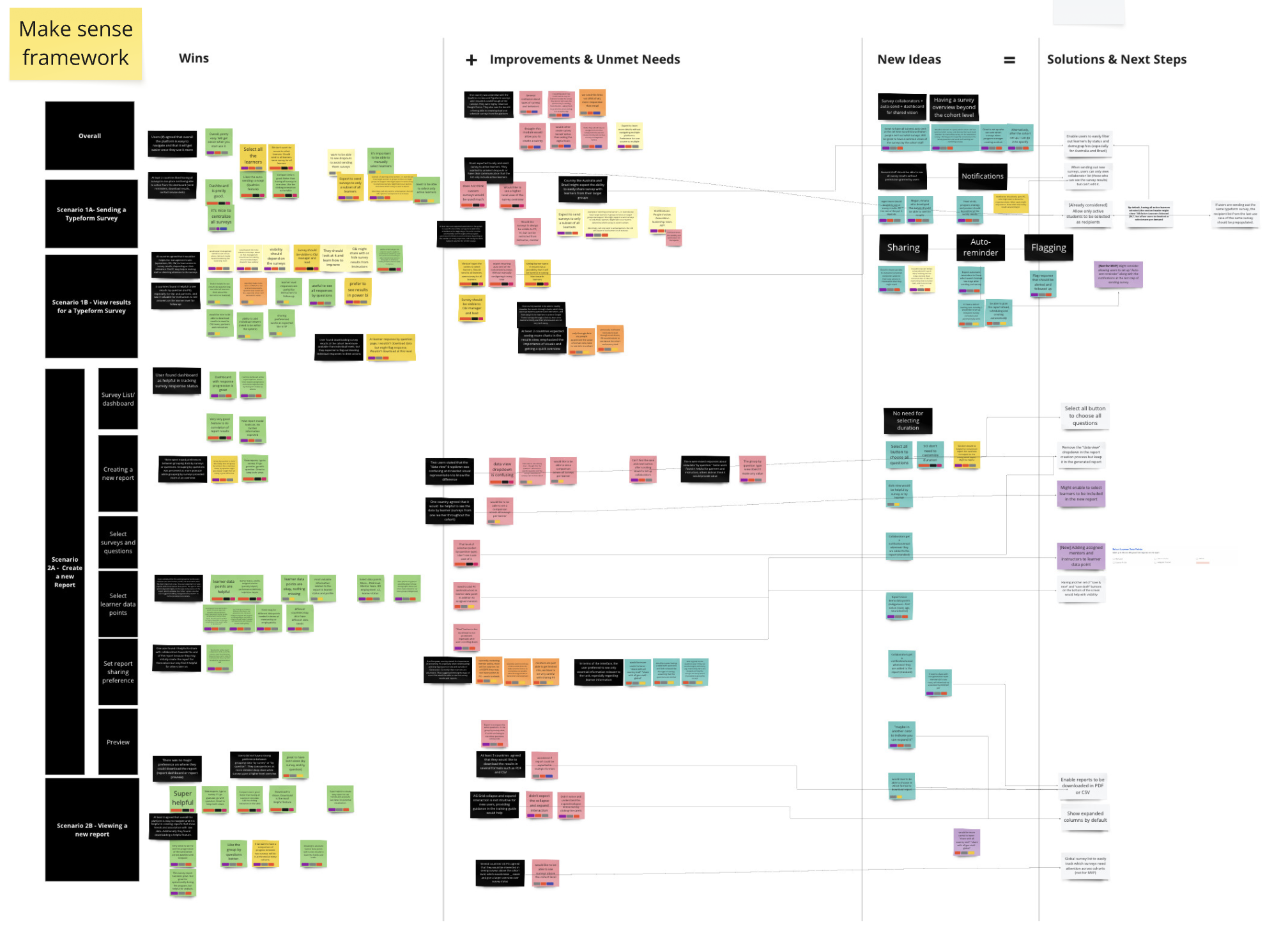 For each round of interviews, we utilized the “Make sense framework,” a McKinsey-developed research framework, to synthesize research into insights by tagging validations, unmet needs, and new ideas, to identify design and research opportunities.